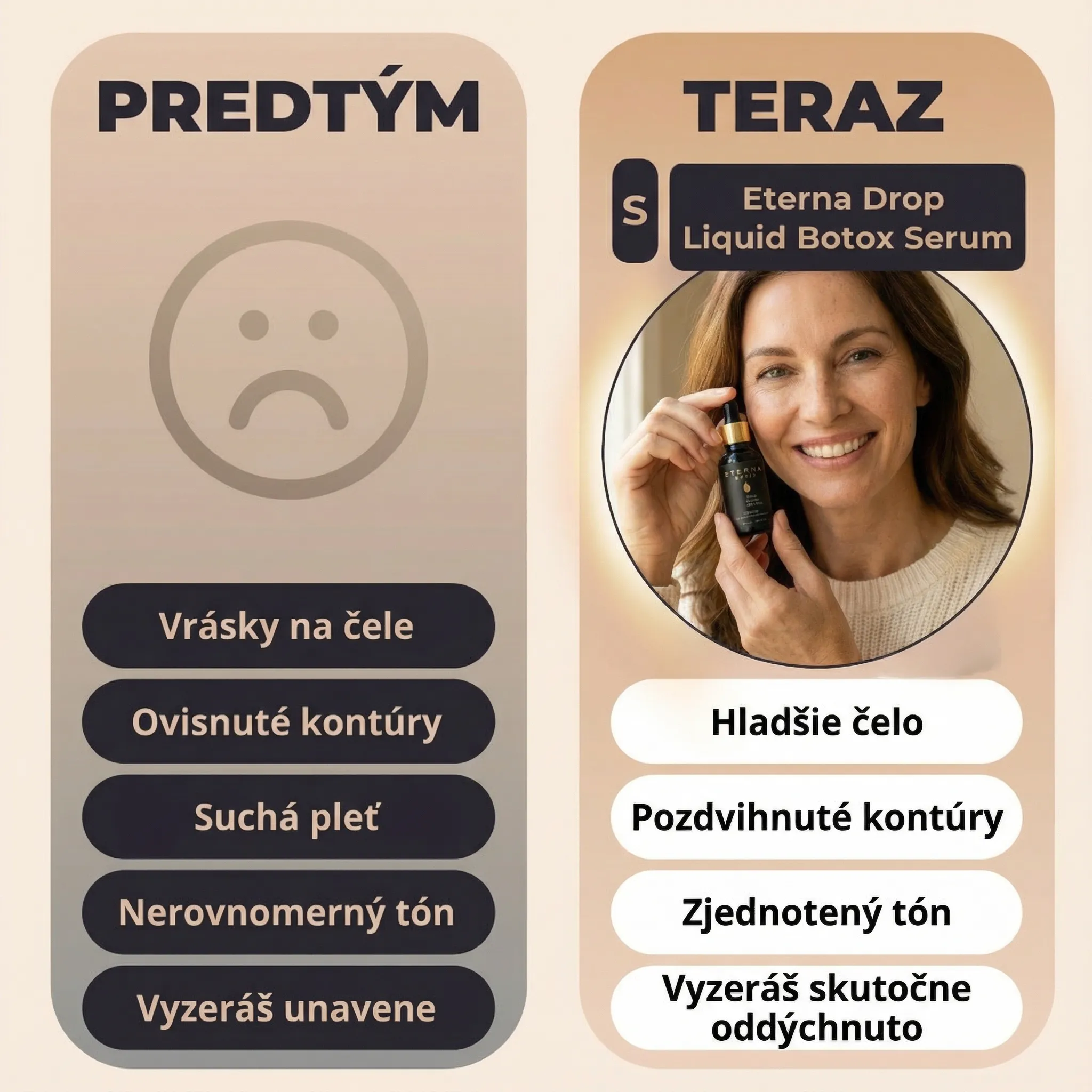 Botox kvapky Eterna Drop ma ohromili už od prvého nanesenia. Textúra je mimoriadne ľahká a nezanecháva na pleti lepivý film. Majú upokojujúci účinok a zároveň hĺbkovo hydratujú. Po pravidelnom používaní je badateľné viditeľné vyhladenie jemných línií a sviežejší vzhľad tváre.